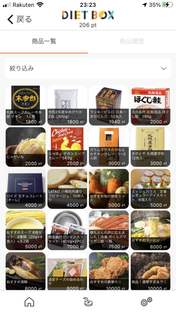 交換できる景品は360ポイントのお菓子から10,000ポイントのお高めの食材まであり、交換レートは1ポイント=約0.3円程度かと思います。