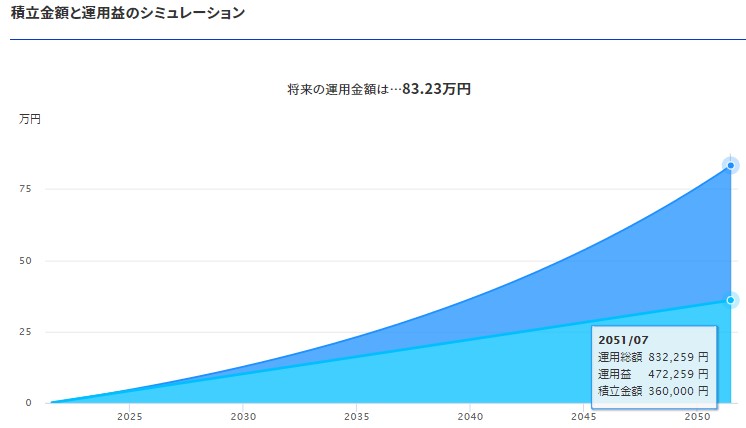 積立金額が360,000円なのに対して、30年後の総額は832,259円と2倍以上の金額にまで膨れ上がっています。