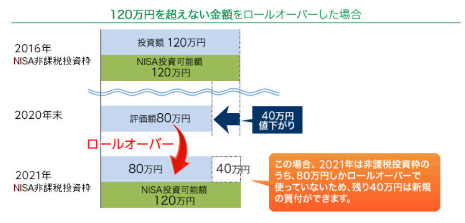 反対に、5年間運用した結果、価格が80万円に値下がりしていた場合、新しい年の非課税枠を80万円分だけ使って移行し、残りの40万円分の非課税枠で新たに投資を行うことができます。