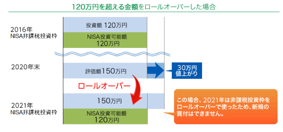 NISAの非課税投資枠は最大120万円ですが、ロールオーバーする資産が120万円を超えている場合でも全額を新たな非課税投資枠に移管することができます。