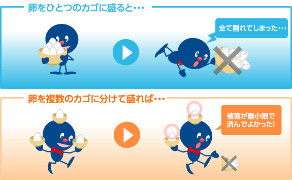 複数のカゴに分散させれば一つのカゴをひっくり返しても被害が少ないという事を表しています。