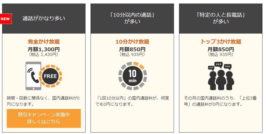 また、音声通話付きプランには、3つのかけ放題プランが揃っており、ネットだけでなく、通話も楽しみたい人にもおすすめです。