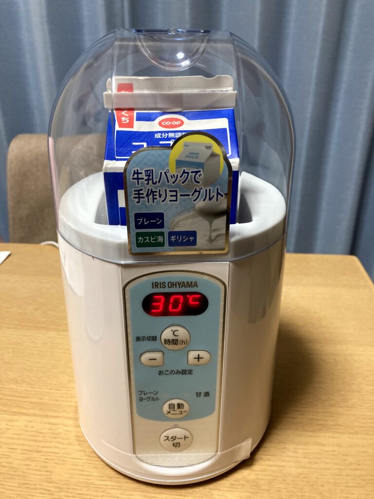 牛乳パックに蓋をしてヨーグルトメーカーにセットします。